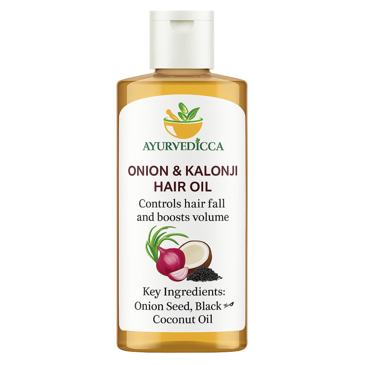 Ayurvedicca Onion & Kalonji Hair Oil is a powerful blend of Onion Seed, Black Seed (Kalonji), and Coconut Oil that helps control hair fall and boost hair volume naturally. Experience stronger, thicker, and healthier hair with regular use.